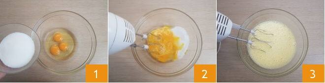 Pour préparer le cake à l'ananas et au yaourt grec, commencez par réaliser la pâte. Versez les œufs dans un bol, ajoutez le sucre 1 et montez avec un batteur électrique 2 pour obtenir une masse mousseuse 3.