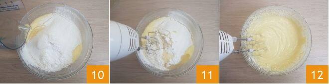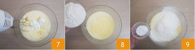 Travaillez encore avec le batteur électrique, cette fois à vitesse basse 7. Quand le yaourt est bien incorporé, ajoutez la farine 8 et la levure 9 préalablement tamisées.