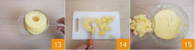 Égouttez ensuite l'ananas 13 et prenez 150 g. Coupez-le en cubes assez gros 14 et ajoutez-les à la pâte 15.