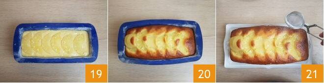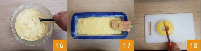 Mélangez avec une spatule 16 et versez dans un moule de 28x10 cm préalablement beurré et fariné. Nivelez la surface avec une spatule 17. Coupez ensuite en deux les 3 tranches d'ananas restantes 18