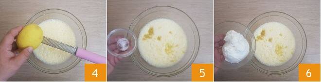 Ajoutez ensuite le zeste de citron râpé 4, une pincée de sel 5 et le yaourt grec 6.