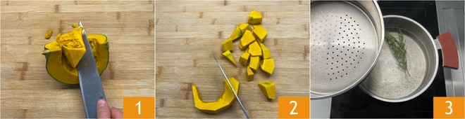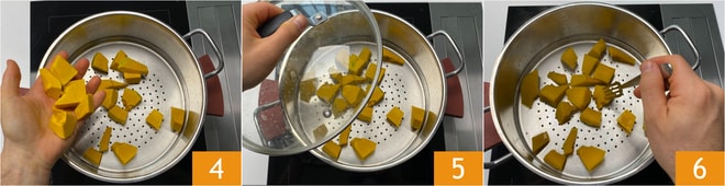 Ajoutez la citrouille 4, couvrez 5 et laissez cuire 10 minutes ou jusqu'à ce qu'elle soit tendre, testez la consistance en piquant la citrouille avec une fourchette 6.