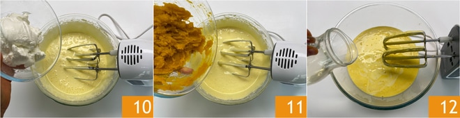Lorsque le mélange devient mousseux, ajoutez le yaourt 10, la chair de citrouille 11 et l'huile de graines 12.
