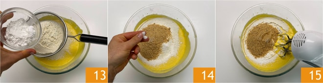 Éteignez le batteur et tamisez la farine, la fécule et la levure 13. Ajoutez également la farine de noisettes et le sel 14, mélangez à nouveau avec le batteur 15 pour obtenir une pâte homogène.