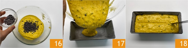 Complétez avec les pépites de chocolat en en réservant un peu pour la surface 16. Transférez la pâte dans un moule de 22 cm x 8,5 cm, haut de 7 cm, beurré et fariné 17, et plongez la pointe d'un couteau – imbibée d'huile – le long de toute la surface comme pour diviser en deux sur la longueur.