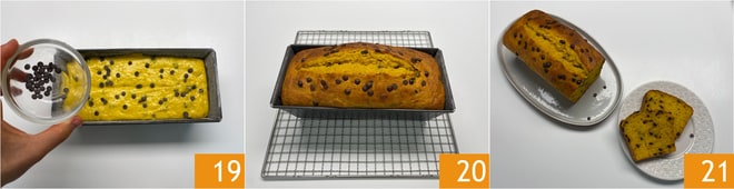 Ajoutez les pépites réservées 19 et faites cuire dans un four statique préchauffé à 170° pendant 55/60 minutes. Sortez du four et laissez refroidir 20, puis démoulez et servez le cake à la citrouille et au chocolat 21.