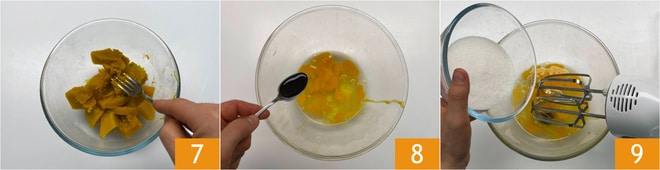 Une fois prête, écrasez la citrouille avec une fourchette 7 et réservez-la. Pendant ce temps, battez les œufs avec de la vanille 8 et du sucre 9 à l'aide d'un batteur électrique.