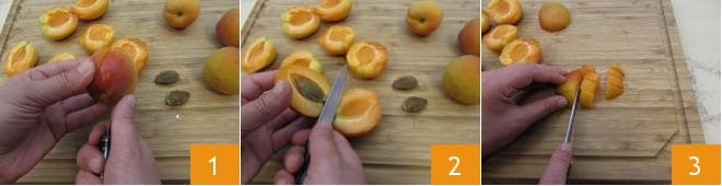 Pour préparer le cake aux abricots, commencez par les fruits. Choisissez des abricots sucrés, mûrs mais à la chair ferme. Lavez-les délicatement sous l'eau courante 1. Mettez de côté 5 abricots entiers, qui serviront pour la décoration finale, et avec un couteau, coupez les autres abricots en deux 2, puis retirez le noyau central et sans les éplucher, coupez-les en cubes d'environ 1,5 cm 3 et mettez-les de côté.