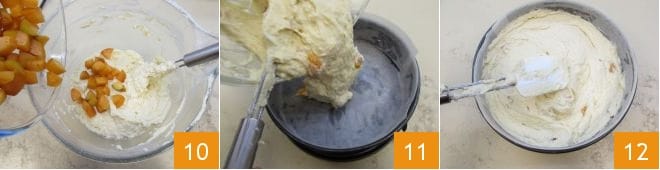 Ajoutez également les morceaux d'abricot à la pâte 10 et mélangez jusqu'à bien amalgamer le tout. Transférez le mélange dans un moule de 24 cm de diamètre, préalablement beurré et tapissé de papier sulfurisé 11 et égalisez la surface avec une spatule 12.