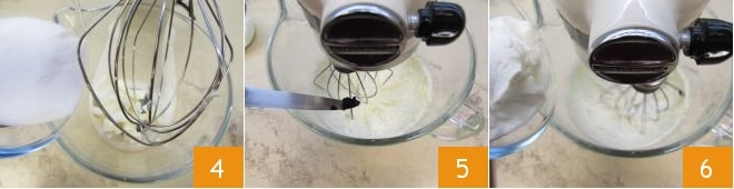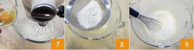 Ajoutez les œufs entiers et le jaune, un par un, et laissez-les s'incorporer à la pâte 7, puis fouettez pendant quelques minutes et éteignez la machine. Tamisez la farine, mélangée avec la levure, directement dans le bol 8 et mélangez avec un fouet à main 9, en veillant à ne pas trop dégonfler le mélange. Ajoutez à ce stade également le sel.