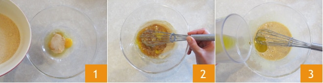Pour préparer le cake au citron sans beurre, commencez par travailler dans un bol les œufs et 180 g de sucre de canne 1. Fouettez pendant quelques instants avant d'ajouter l'huile en filet 3.