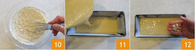 En continuant à travailler avec le fouet, mélangez bien pour obtenir un mélange fluide et homogène 10. Versez dans un moule huilé et fariné. Les dimensions du moule sont de 22x8 cm en bas, tandis que la partie supérieure mesure 25x10 cm 11. Saupoudrez la surface avec les amandes hachées grossièrement au couteau 12.