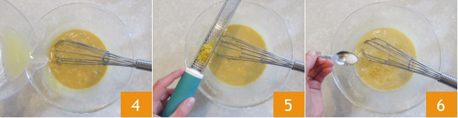 Dès que le gras est absorbé, ajoutez le jus 4 et le zeste de citron râpé 5. En continuant à mélanger, ajoutez le sel 6,