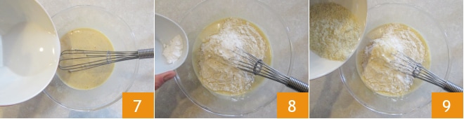 le lait d'amande 7, la farine type 2, la levure chimique 8 et la farine d'amande 9.