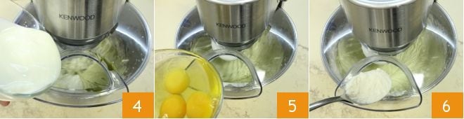 le yaourt 4, les œufs un à un 5 et le sel. Quand les œufs se sont bien mélangés au mélange, ajoutez également la farine et la levure tamisées 6