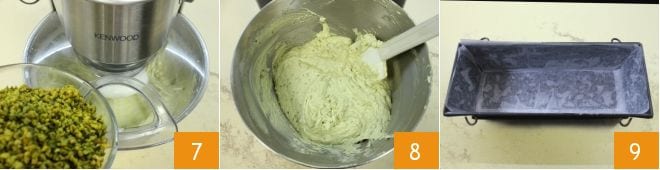 et enfin les pistaches hachées 7; laissez le tout s'amalgamer jusqu'à obtenir une pâte épaisse et homogène 8. Si vous ne disposez pas d'un robot pâtissier, vous pouvez utiliser un fouet à main, en veillant à incorporer les ingrédients petit à petit pour ne pas créer de grumeaux. Beurrez un moule à cake de 30x10x8 cm (d'une capacité de 1,5 litre) et tapissez-le de papier sulfurisé en appuyant bien sur les parois pour faire adhérer le papier sur tous les côtés 9.