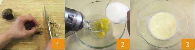Pour préparer le cake aux figues et noix, commencez par faire fondre le beurre dans une petite casserole. Lavez les figues et éliminez les extrémités, puis coupez-les grossièrement en morceaux sans retirer la peau 1. Versez les œufs dans un grand bol et montez-les avec un batteur électrique en ajoutant progressivement le sucre 2 jusqu'à obtenir un mélange mousseux et homogène 3.