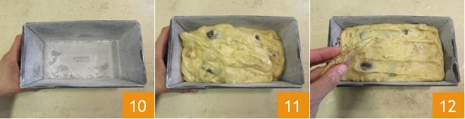 À ce stade, beurrez et farinez un moule à cake de 20x11 cm et versez-y le mélange obtenu 11. Nivelez la surface avec le dos d'une cuillère légèrement humidifiée avec de l'eau et disposez les tranches de figue que vous aurez préalablement coupées 12.