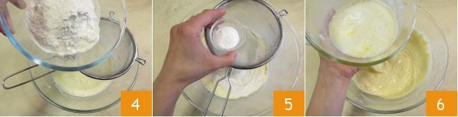 Tamisez la farine 4 et la levure 5 dans le bol, puis mélangez avec une spatule et ajoutez également le beurre fondu 6.