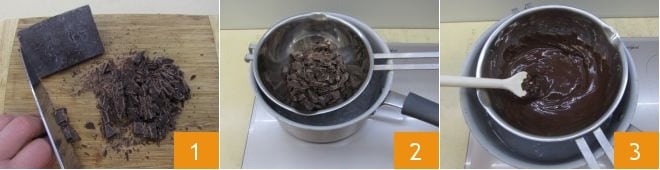 Pour préparer le cake aux poires et chocolat, commencez par hacher grossièrement le chocolat noir avec un couteau 1, puis transférez-le dans un bol placé à l'intérieur d'une casserole avec de l'eau, pour la cuisson au bain-marie (l'eau doit frôler le fond de la casserole dans laquelle vous avez mis le chocolat) 2. Faites fondre le chocolat à feu modéré jusqu'à obtenir une sauce épaisse 3, puis laissez tiédir. Pendant ce temps, poursuivez la préparation.