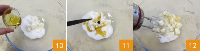 le miel 10 et les graines extraites de la gousse de vanille 11. Battez le mélange avec un mixeur électrique jusqu'à ce qu'il soit clair et mousseux 12