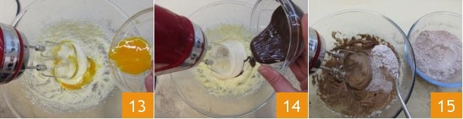 puis incorporez également les œufs, en continuant de battre avec le mixeur 13. Enfin, versez le chocolat précédemment fondu 14. Ajoutez maintenant au mélange les poudres tamisées peu à peu avec une cuillère 15, sans cesser de battre avec le mixeur électrique.