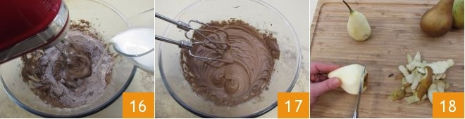 Pour finir, versez progressivement le lait à température ambiante 16 et continuez à mélanger jusqu'à obtenir un mélange homogène 17. Épluchez les poires en veillant à conserver la queue, puis égalisez avec un couteau la partie inférieure 18.