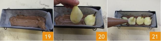 Beurrez et farinez un moule à cake de 27x11 cm avec un bord haut de 8 cm, d'une capacité de 1,5 litre (alternativement, vous pouvez le beurrer puis tapisser le fond et le bord avec du papier sulfurisé). Il est conseillé d'utiliser un moule amovible qui permettra de démouler le gâteau plus facilement. Répartissez une couche de pâte à l'intérieur du moule 19, puis disposez les poires épluchées de manière à ce qu'elles soient en position verticale, avec la queue vers le haut 20. Transférez le reste du mélange dans une poche à douille et finissez de remplir le moule 21 en distribuant la pâte tout autour des poires,