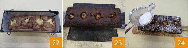 jusqu'à les recouvrir complètement, en laissant juste les queues à l'extérieur 22. Faites cuire le gâteau dans un four statique préchauffé à 170°C pendant 75 minutes. Si pendant la cuisson le cake devait trop brunir, couvrez-le avec du papier aluminium et poursuivez ainsi la cuisson. Une fois cuit, sortez le cake aux poires et chocolat du four et laissez-le refroidir, puis démoulez-le 23 et saupoudrez la surface de sucre glace 24. Le cake aux poires et chocolat est prêt à être dégusté !