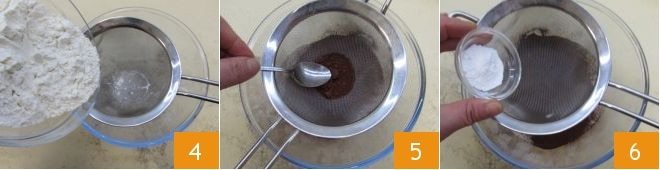 Dans un bol, tamisez la farine type 00 4, le cacao en poudre non sucré 5 et la levure chimique pour pâtisserie 6, en vous aidant du dos d'une cuillère à café.