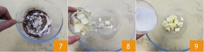 Mélangez les poudres pour les amalgamer 7. Dans un autre bol, placez les morceaux de beurre ramolli 8, le sucre en poudre 9,
