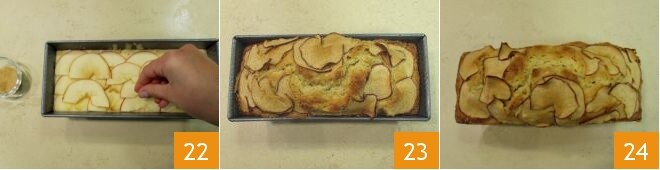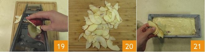 Beurrez et farinez un moule à cake et remplissez-le avec la pâte. Avec une mandoline, tranchez la demi-pomme restante en tranches d'environ 3 mm (19-20). Décorez la surface du cake avec les tranches de pomme 21 en couvrant toute la surface.