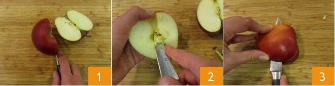 Pour préparer le cake aux pommes, lavez et coupez les pommes en deux 1, puis enlevez les pépins et le trognon 2. Coupez 1 pomme et demie dans le sens de la longueur 3,