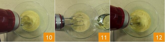 travaillez pendant quelques minutes avec un batteur électrique 10, puis ajoutez l'huile de graines 11 et continuez à travailler pour bien amalgamer le tout 12.