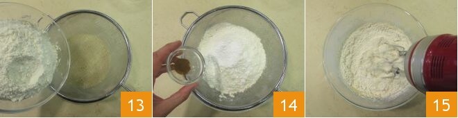 Tamisez la farine 13 et la levure dans le bol, ajoutez également la cannelle 14 et continuez à travailler avec le batteur électrique 15