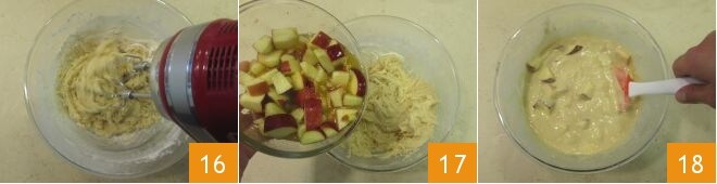 pour obtenir une pâte lisse et homogène 16. Ajoutez les pommes que vous aviez fait mariner avec le sucre et le jus d'orange 17 et mélangez avec une spatule pour les incorporer à la pâte 18.