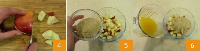 de cette façon, il sera plus facile de la réduire en cubes réguliers d'environ 1 cm 4. Versez les morceaux de pomme dans un bol, ajoutez 50 g de sucre de canne 5 et le jus d'une orange pressée et filtrée 6.