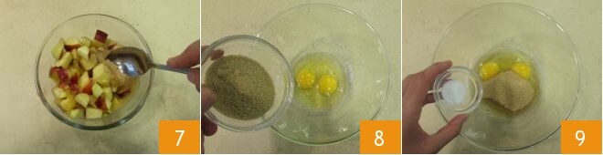 Mélangez et mettez de côté 7. Dans un bol, versez les œufs, 100 g de sucre de canne 8 et le sel 9,