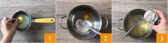 Pour préparer le cake de grand-mère, commencez par réaliser la crème pâtissière. Versez le lait dans une casserole avec le zeste de citron entier 1 et faites-le chauffer à feu doux, sans le faire bouillir. Dans une autre casserole, versez le sucre et l'œuf 2, battez rapidement avec un fouet, puis incorporez la farine 3.
