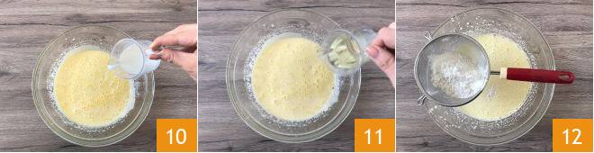 incorporez le lait 10, l'huile 11 et continuez à mélanger avec le batteur. Ajoutez la farine tamisée 12.