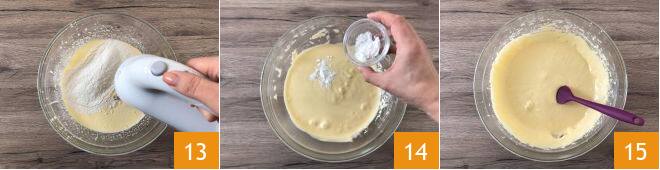 et mélangez encore avec le batteur électrique 13. Ajoutez la levure 14 et mélangez encore avec une spatule jusqu'à obtenir une pâte lisse et homogène 15.