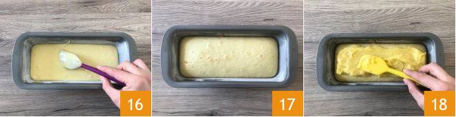 Huilez et farinez un moule à cake de 25x11 cm. Versez la moitié de la pâte dans le moule et nivelez avec la spatule 16. Faites cuire dans un four statique préchauffé à 180° pendant environ 15 minutes. Retirez ensuite le cake du four 17 et répartissez la crème pâtissière par-dessus, sans atteindre les bords 18.
