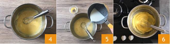 et mélangez encore avec le fouet jusqu'à obtenir un mélange homogène 4. Dès que le lait est chaud, retirez le zeste de citron et versez-le dans le mélange d'œufs, de sucre et de farine 5. Mélangez avec un fouet et remettez sur le feu. Faites cuire pendant quelques minutes, en continuant de mélanger, jusqu'à ce que la crème épaississe 6. Retirez du feu, transférez dans un bol et laissez tiédir.