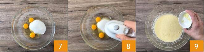 Passez maintenant à la pâte du cake. Dans un grand bol, versez les œufs et le sucre 7. Battez avec un batteur électrique jusqu'à obtenir un mélange clair et mousseux 8. Ajoutez le zeste de citron râpé 9,