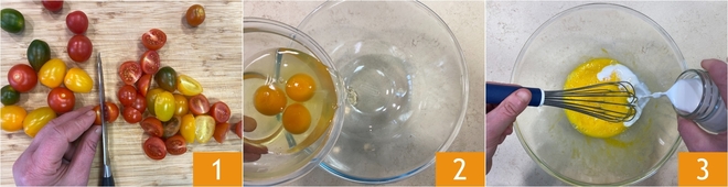 Pour préparer le cake 12 cuillères salé aux tomates cerises et aux olives, commencez par laver les tomates cerises et les couper en deux 1. Cassez les œufs dans un grand saladier 2. Battez-les au fouet à main jusqu'à obtenir un mélange homogène, puis versez le lait en filet en continuant à mélanger 3.