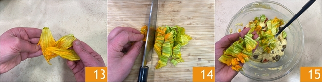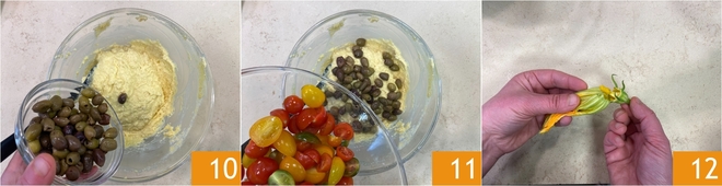 Mélangez soigneusement jusqu'à obtenir une pâte lisse, moelleuse et sans grumeaux, puis incorporez les olives dénoyautées 10 et une bonne partie des tomates cerises 11. Gardez-en une dizaine pour la décoration finale. Nettoyez délicatement les fleurs de courgette en retirant le pistil intérieur 12.