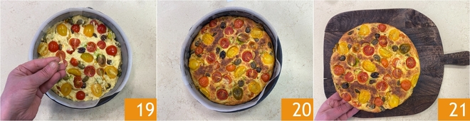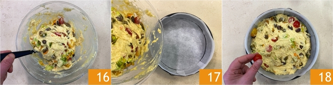 Mélangez bien pour répartir uniformément tous les ingrédients 16. Tapissez un moule de 24 cm de diamètre de papier sulfurisé et versez-y la préparation 17. Nivelez la surface avec le dos d'une cuillère, puis décorez avec les tomates cerises réservées 18.