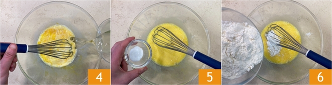 Ajoutez l'huile en filet en continuant de battre 4 ; incorporez le sel 5 et la farine tamisée 6.
