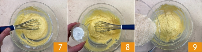 Mélangez au fouet 7, ajoutez ensuite la levure tamisée 8 et le Grana râpé 9.