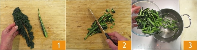 Pour préparer la calamarata avec chou noir et 'nduja, commencez par nettoyer le chou. Séparez les tiges des feuilles 1 et coupez-les en morceaux 2. Plongez-les dans de l'eau bouillante, salée à votre goût, qui servira également pour la cuisson des pâtes 3.